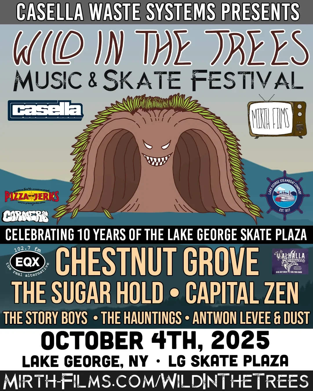 On October 4th, Charles R. Wood Park will be electrified by the sounds of clattering skate wheels and six exhilarating bands! Wild In The Trees, presented by Mirth Films, is returning once again to the Lake George Skate Plaza to celebrate the 10th anniversary of the park's hard-earned opening.